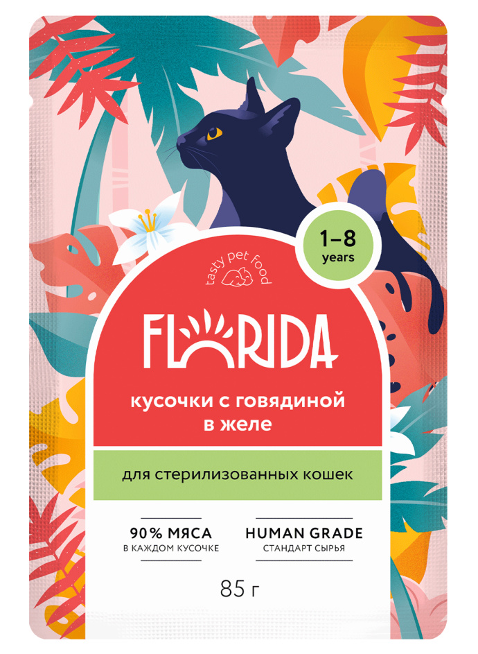 FLORIDA паучи паучи для стерилизованных кошек: кусочки с говядиной в желе (85 г)