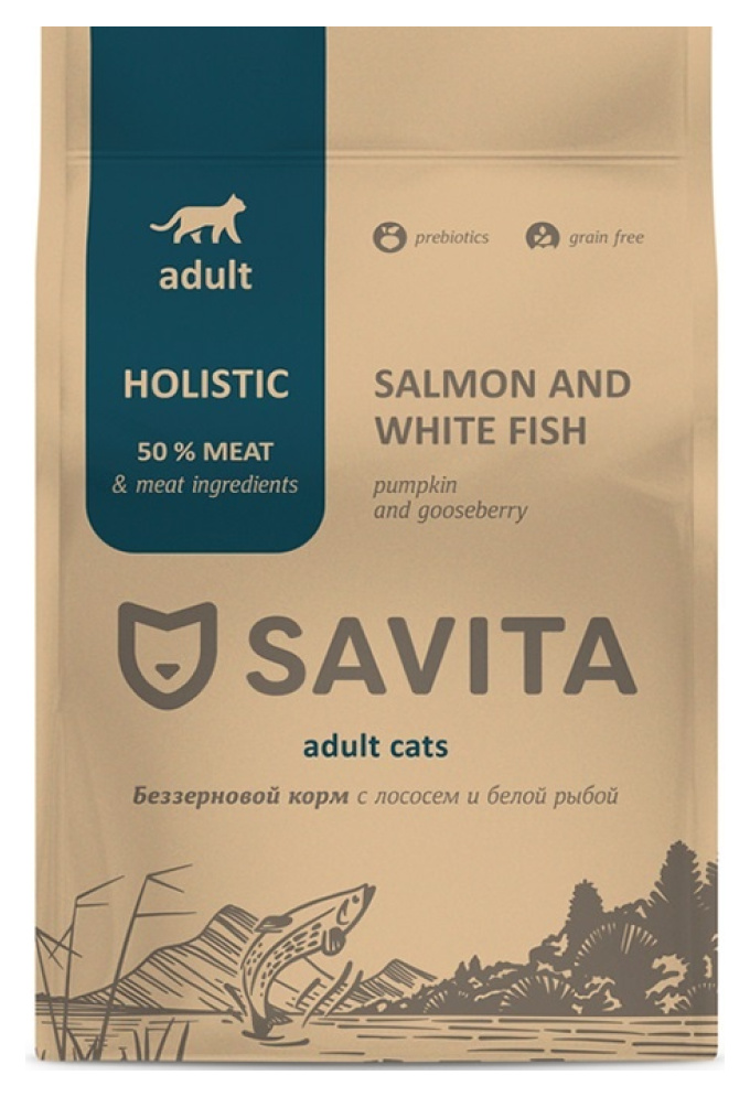 Корм SAVITA беззерновой корм для взрослых кошек с лососем и белой рыбой (5 кг)